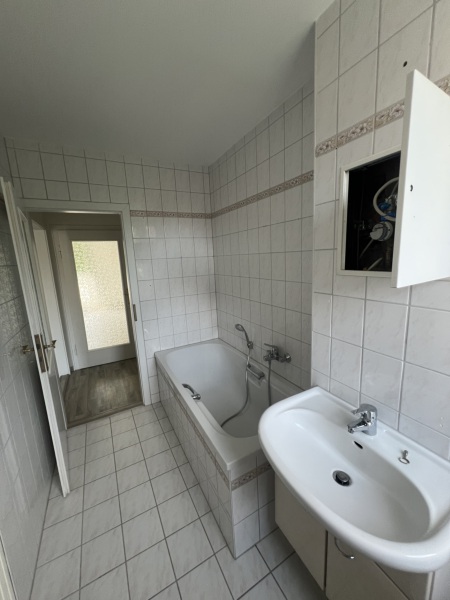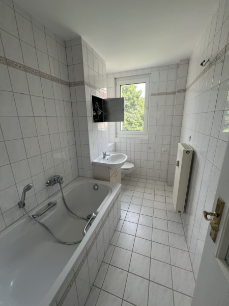 Das Tageslichtbad ist mit einer Wanne ausgestattet und 1,60 hoch gefliest.