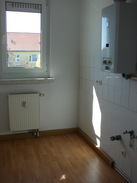 In der Küche befindet sich ein Durchlauferhitzer (mit Gas), über welchen die Warmwasserbereitung in der Küche und im Bad erfolgt. Weiterhin verfügt die Küche über einen Fließenspiegel über den Nassstrecke und sowohl einen Gasherd-, als auch einen Elektroherdanschluss.