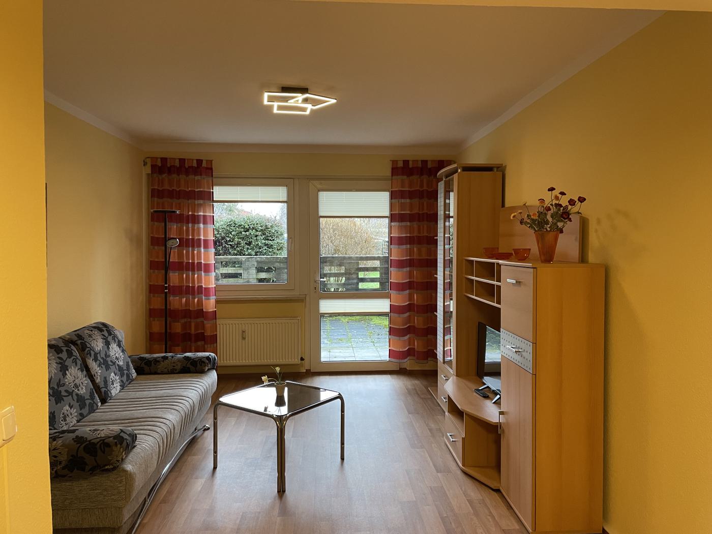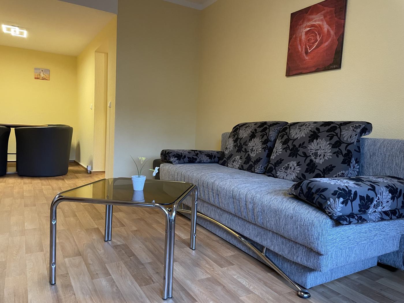 - Wohnzimmer: modern eingerichtet, Couch mit Schlaffunktion