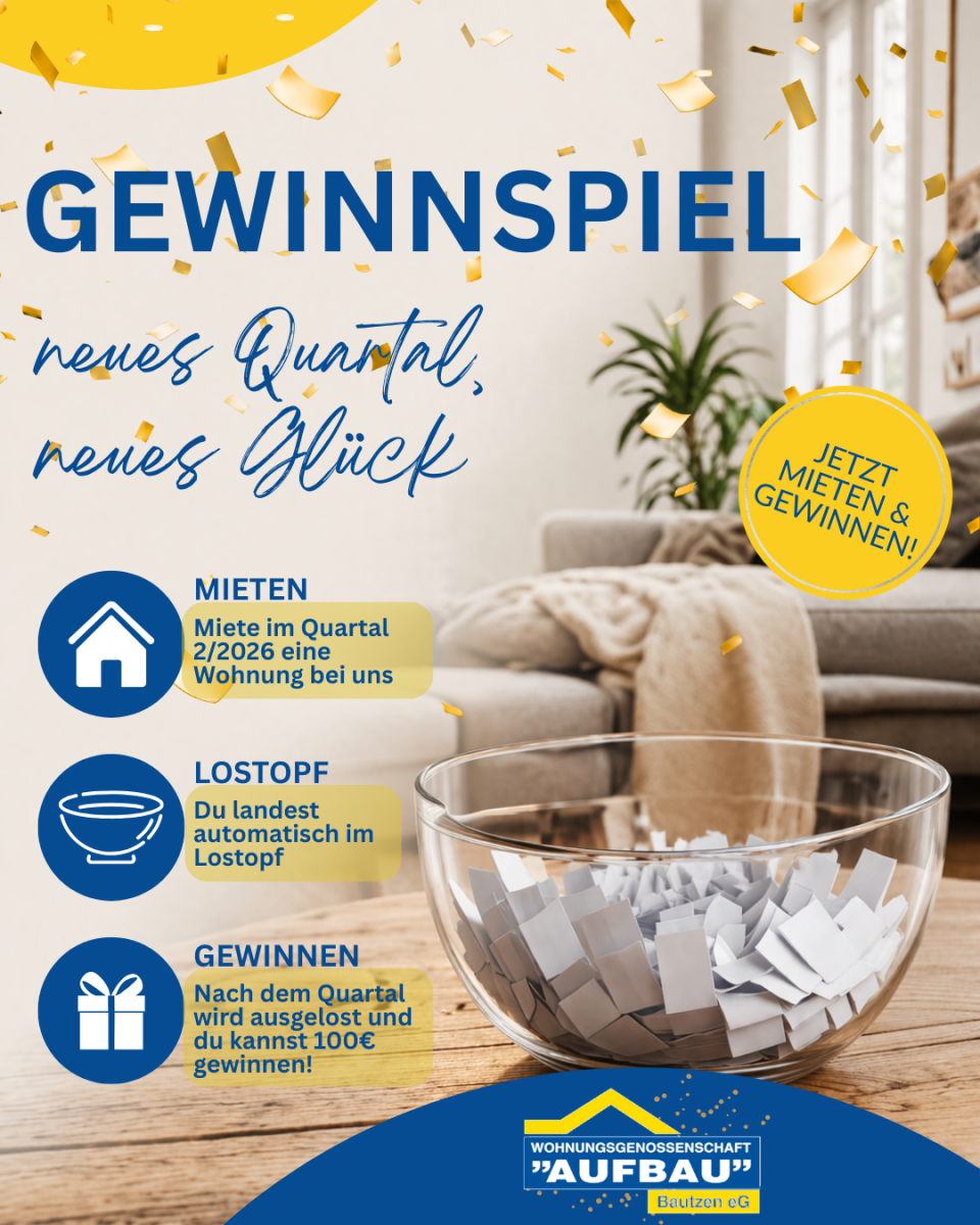 Mitarbeiterinnen und Mitarbeiter der WG Aufbau Bautzen eG sind von der Teilnahme ausgeschlossen. Die Aktion steht in keiner Verbindung zu Facebook oder Instagram und wird von diesen Plattformen weder unterstützt noch organisiert.