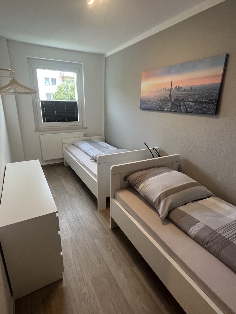 - Kinderzimmer: zwei Einzelbetten (je ca. 1 m breit), Kommode, Kleiderstange