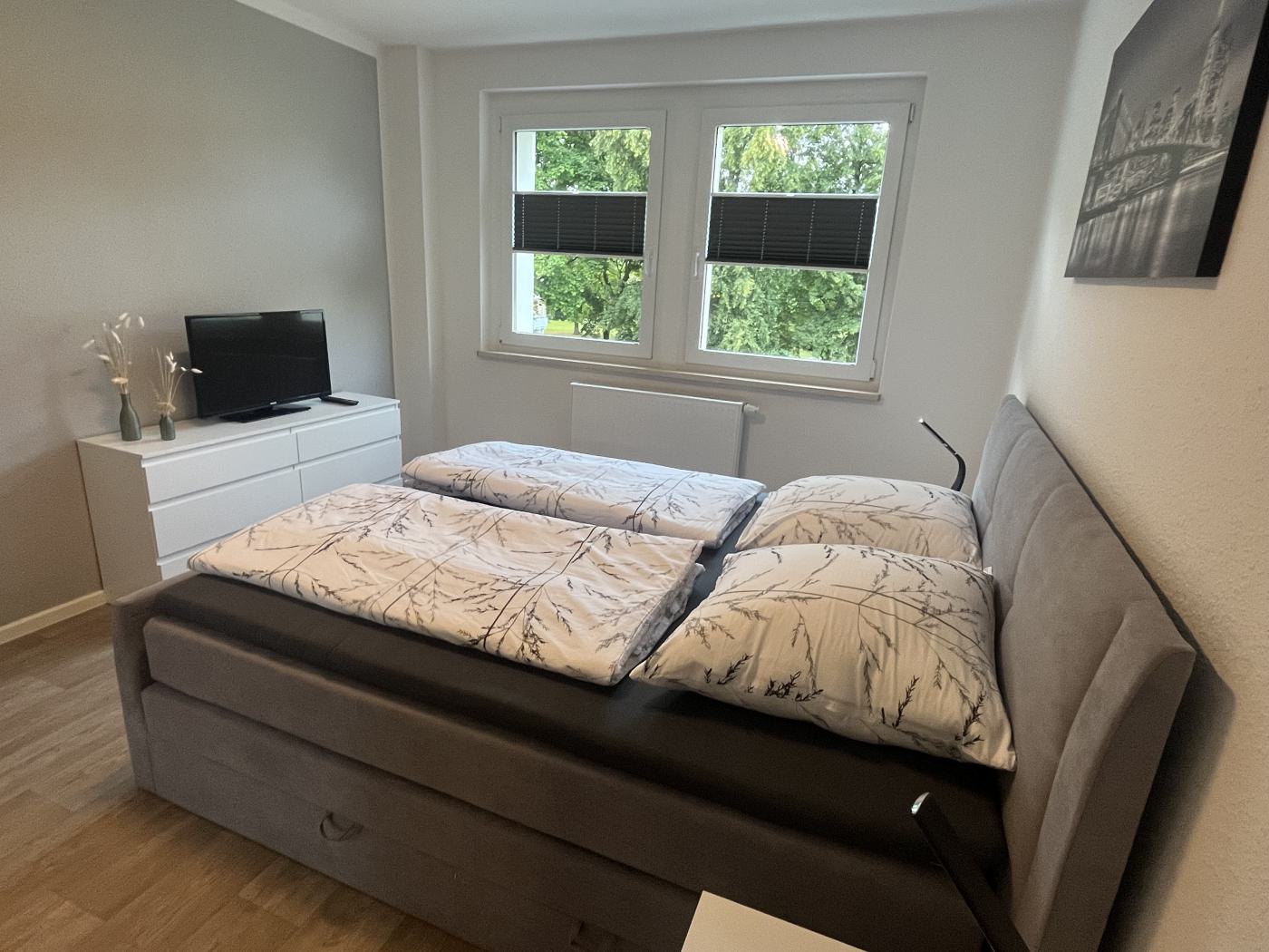 - Schlafzimmer: Boxspringbett (1,80 m x 2,00 m, durchgehende Matratze), Kleiderschrank, Kommode mit Fernseher