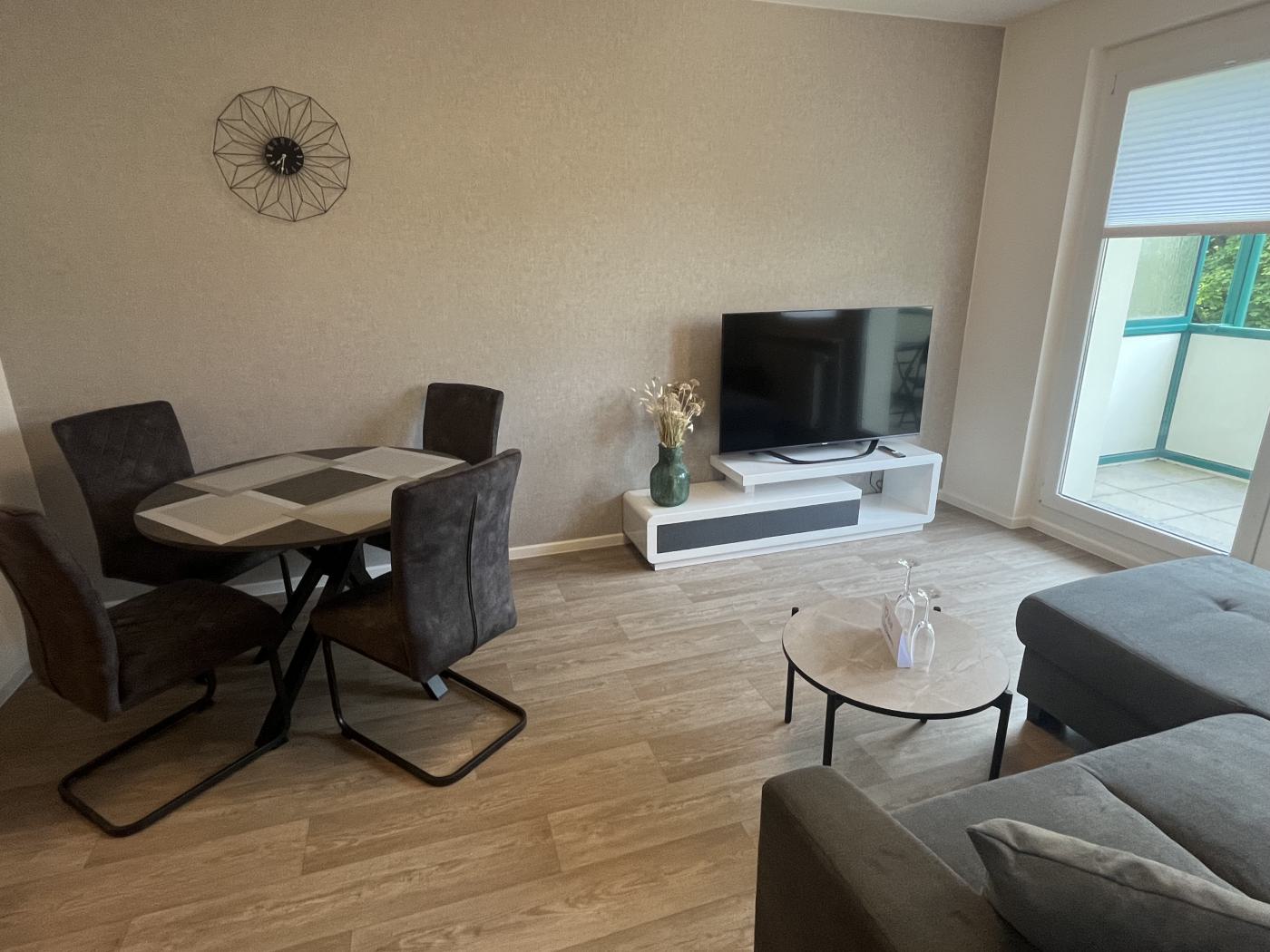 - Wohnzimmer: Couch, Fernseher, Esstisch mit 4 Stühlen
