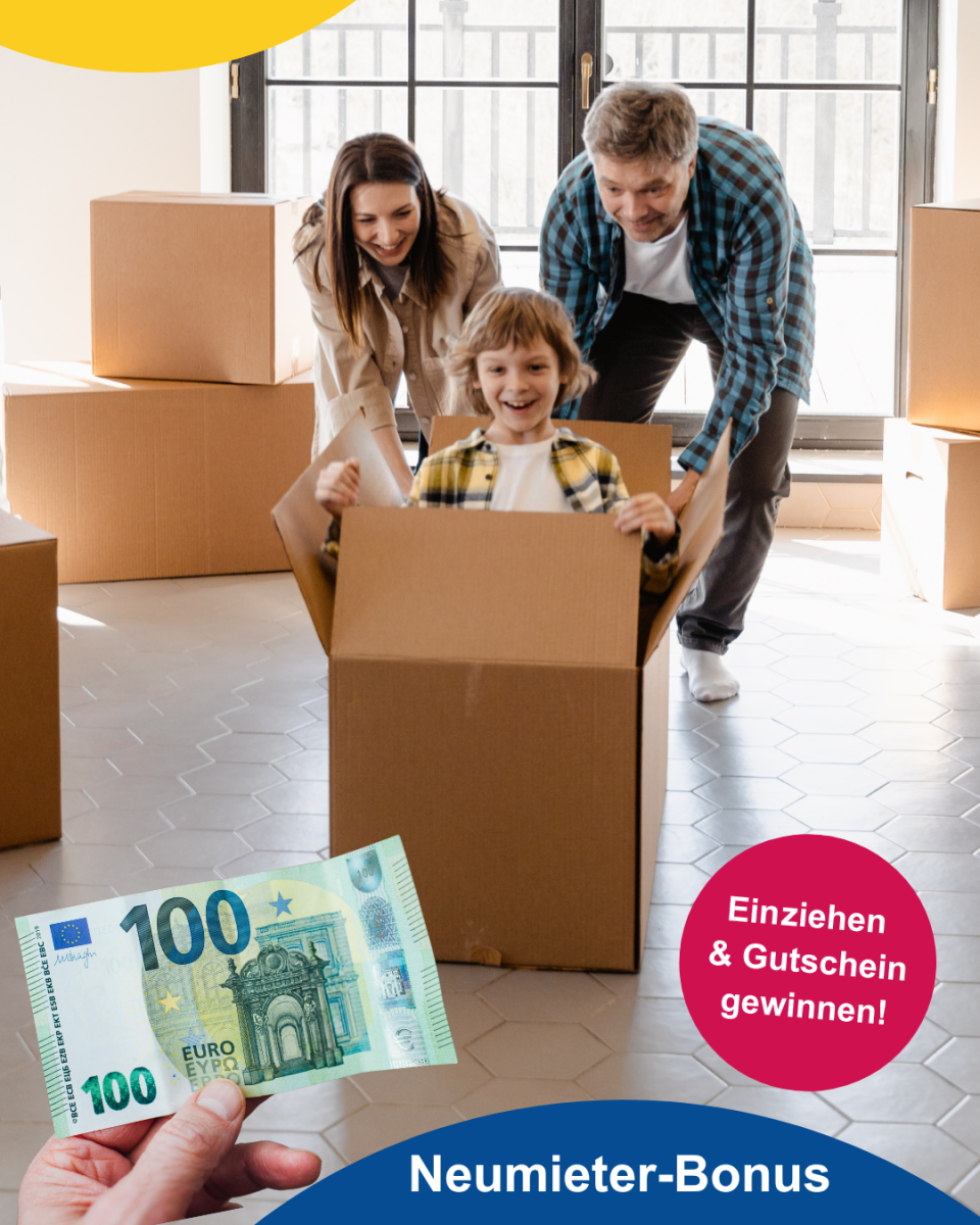 Alle, die im jeweiligen Quartal (01/2026, 02/2026, 03/2026 oder 04/2026) einen Mietvertrag mit unserer Genossenschaft abschließen und in diesem Zeitraum in ihre neue Wohnung einziehen, nehmen automatisch an der Verlosung teil. Am Ende jedes Quartals wird unter allen teilnahmeberechtigten Neumieterinnen und Neumietern ein Gutschein im Wert von 100 € verlost.